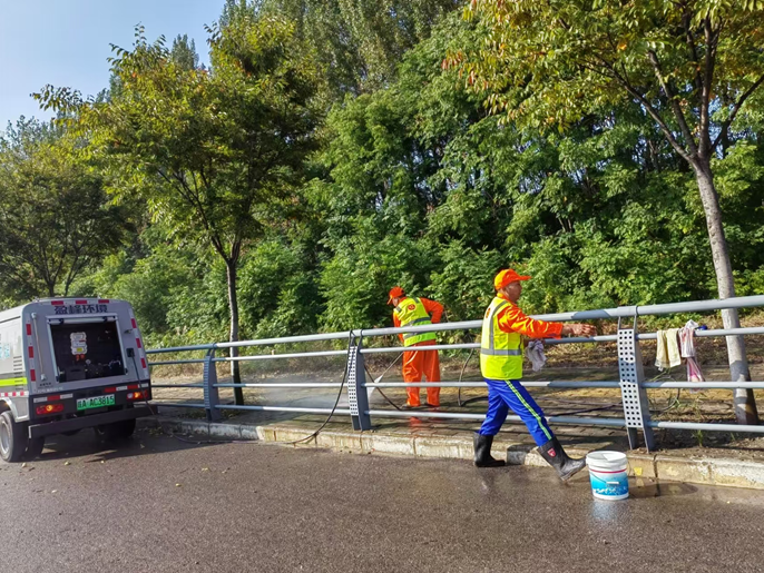 慢車道沖洗在比賽中考驗駕駛員和沖水工的合作默契程度,沖水工每個邊邊腳腳都認真沖洗,駕駛員幫忙擦洗護欄,護欄每條欄桿都洗一遍,擦洗一塵不染。兩個人默契合作顯示團隊精神。